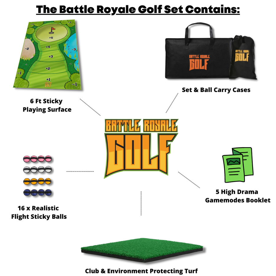 Each Battle Royale Golf set comes ready for immediate action: 1 x Huge 5 Foot Tall Battle Royale Sticky Playing Surface. 16 x Soft Sticky Golf Balls Designed to Mimic Real Golf Ball Flight (4 Colors for 4 Players) 1 x Short Grass Turf For Hitting Balls Off (Simulates Shots Around The Green) 2 x Carry Bags. 5 x High-Drama Game Modes Including: