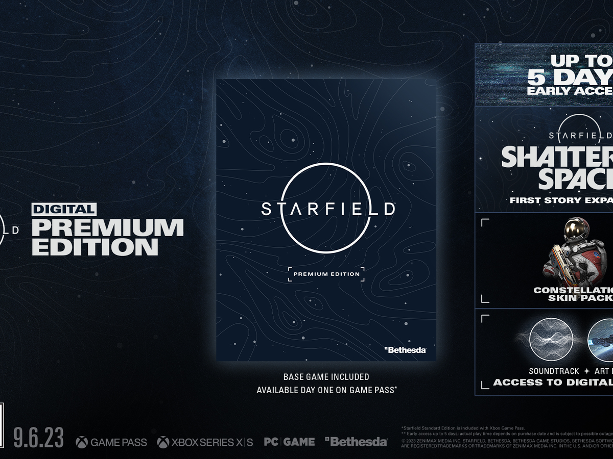 Premium Edition Upgrade (Digital) If you own the Standard Edition of Starfield or have Game Pass, you can pay $34.99 / £34.99 to upgrade it to the Digital Premium Edition to get access to the following content: Shattered Space Story Expansion (upon release) Up to 5 days early access. Constellation Skin Pack.