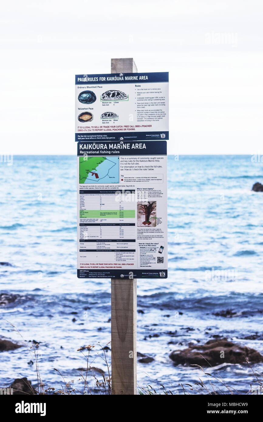 Information board showing Paua rules for the Kaikoura Marine Area issued by the Ministry of