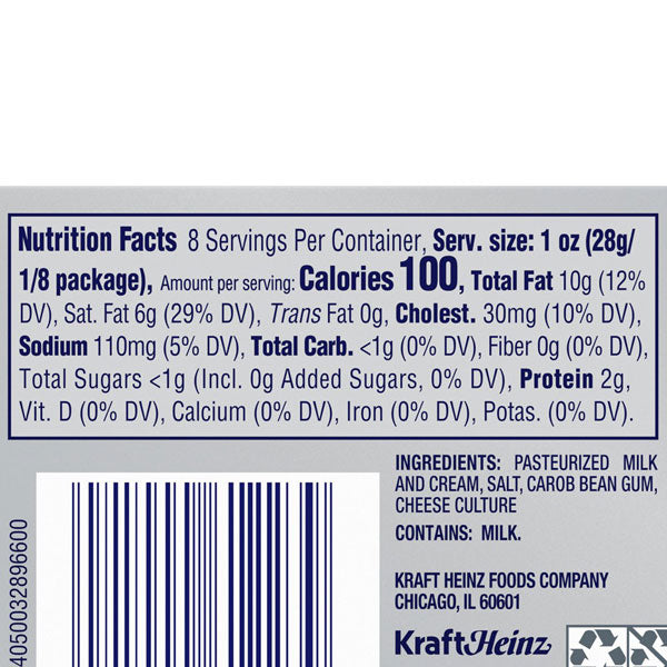 Enjoy the original Philadelphia cream cheese flavor with farm fresh milk and real cream in a brick format. There are no artificial preservatives, flavors or dyes.. Calories. 2. g. Protein. 10. g. Fat. 1. g. Sugars. Serving size: 1 oz (28g/ 1/8 package) Nutrition. Ingredients. Allergen Information. Other Products You May Like. Philadelphia.